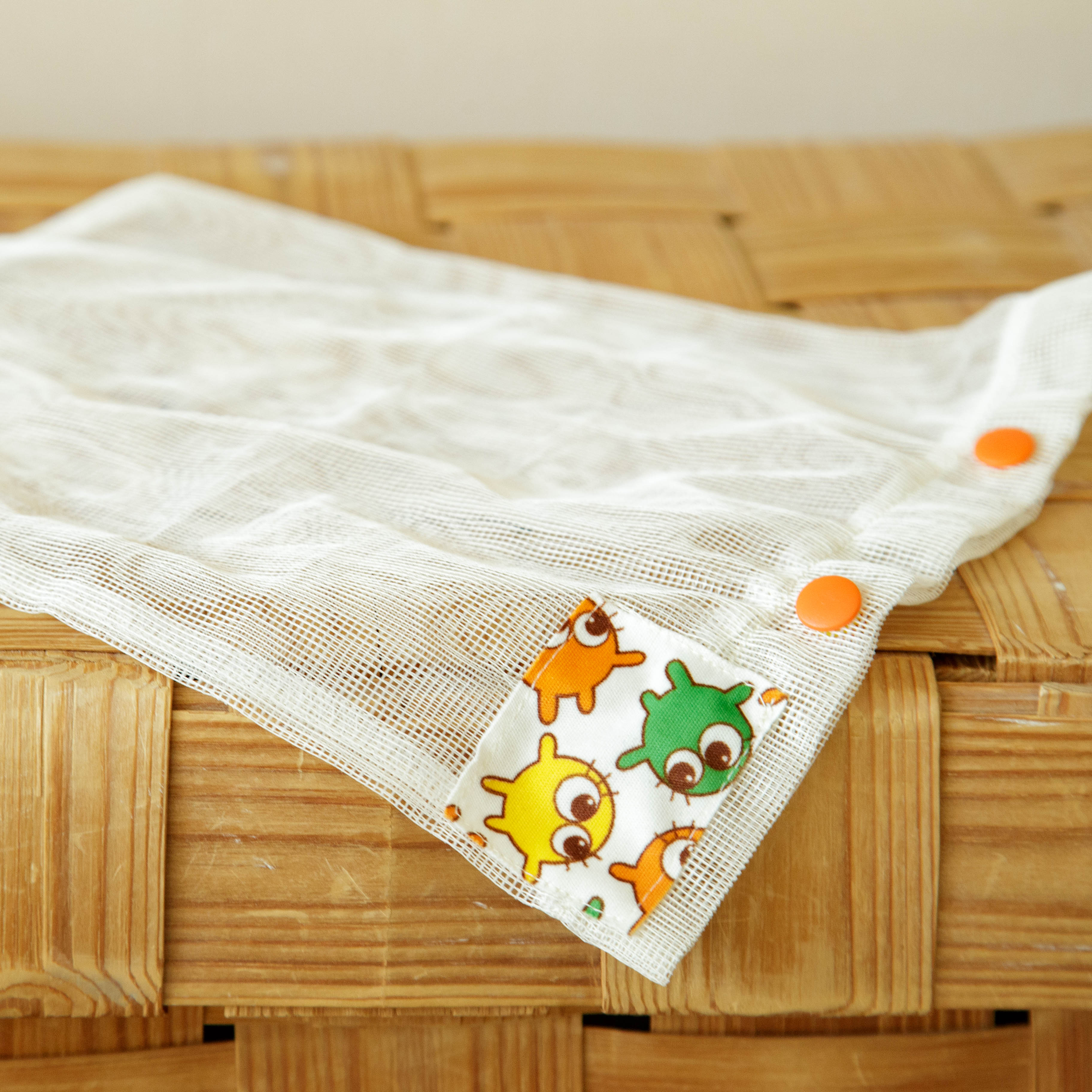 Uusiokäyttöön otetusta valoverhosta ommeltu kestohedelmäpussi. Kulmassa pul-kankaasta ommeltu paikka hintalapulle. Pussi suljettaan kevyillä muovineppareilla. Pussin paino keskimäärin 8g.