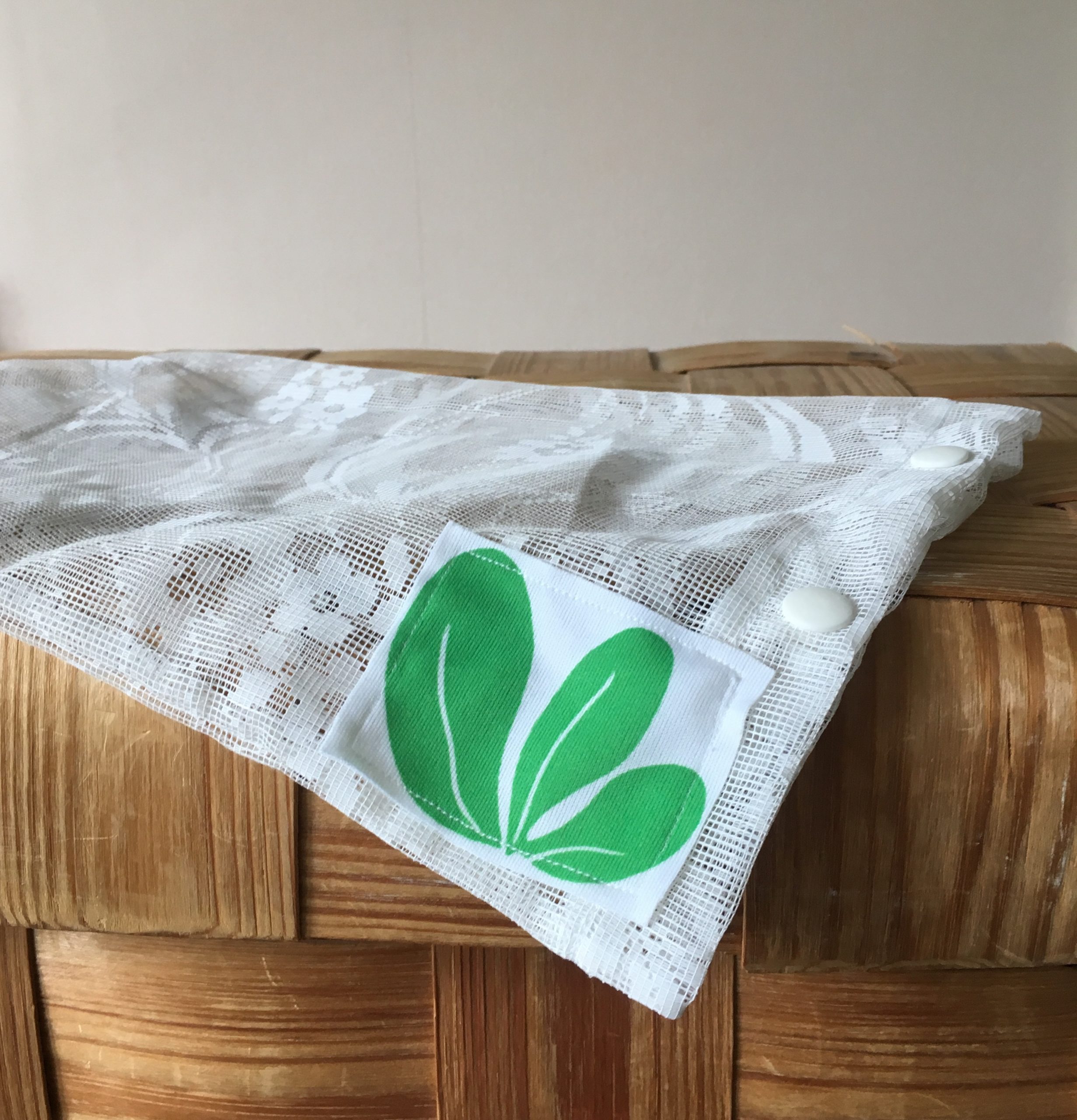 Uusiokäyttöön otetusta valoverhosta ommeltu kestohedelmäpussi. Kulmassa pul-kankaasta ommeltu paikka hintalapulle. Pussi suljetaan kevyillä muovineppareilla. Pussin paino keskimäärin 8g.